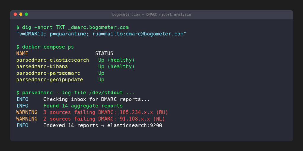 If you run your own domain and don’t have DMARC reporting set up, you’re flying blind. Setting this up took me an afternoon and now I have a permanent window into exactly what’s happening with my domain’s email reputation. The parsedmarc-dockerized project does all the heavy lifting — you just need an IMAP mailbox and a machine with Docker.